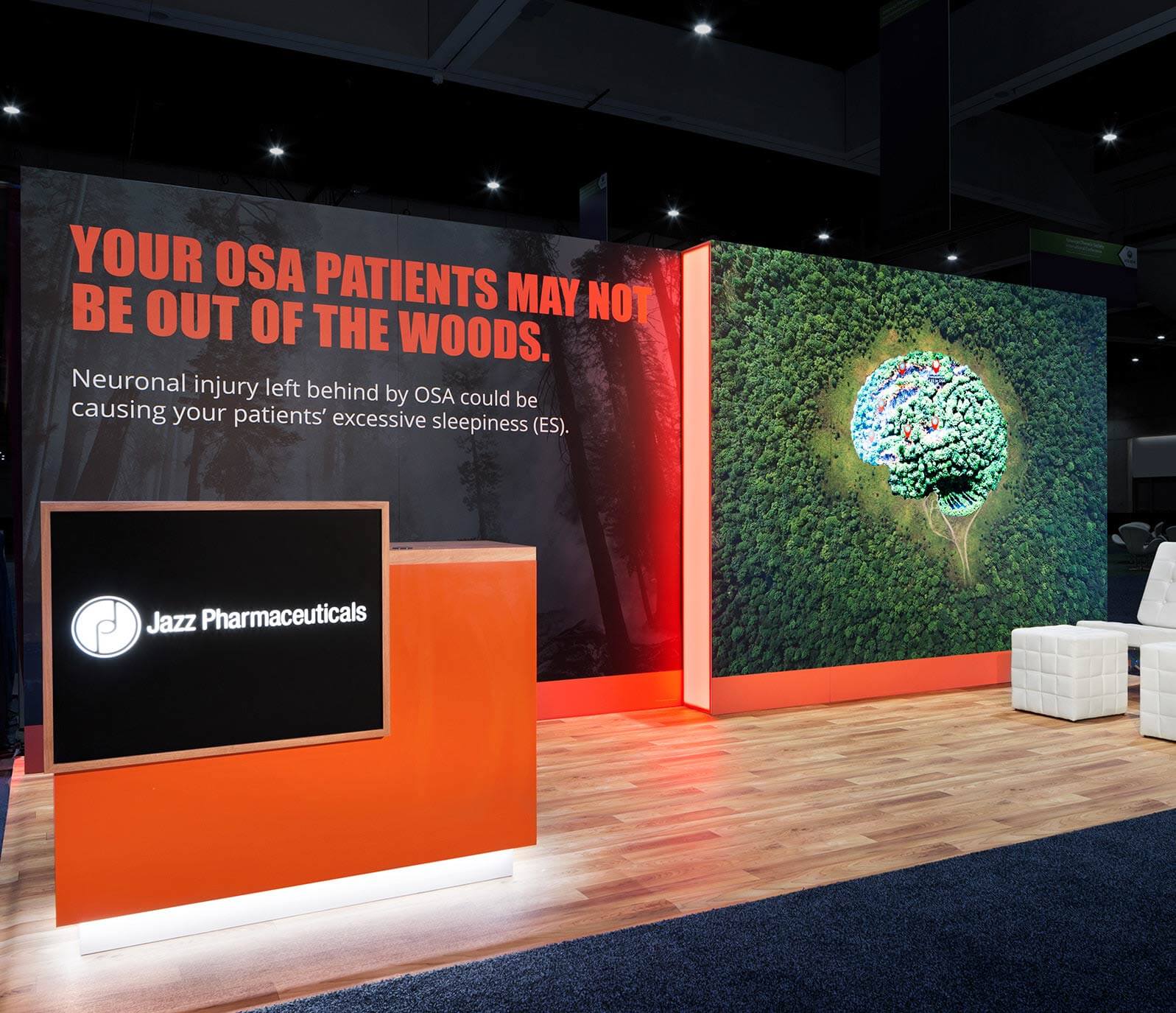 Access created this 10-by-20 foot exhibit to educate physicians about current research related to its promising solution for OSA. While one half of the space featured traditional wood-and-laminate exhibitry, the right half comprised an 80-inch interactive monitor. Here, visitors discovered an image of a forest with a brain in the middle. When attendees touched various parts of the brain, data popped up that explained how that portion of the brain is affected by OSA, a key condition associated with the promising drug. By touching different areas in the graphic, doctors learned what symptoms each affected part of the brain exhibited.